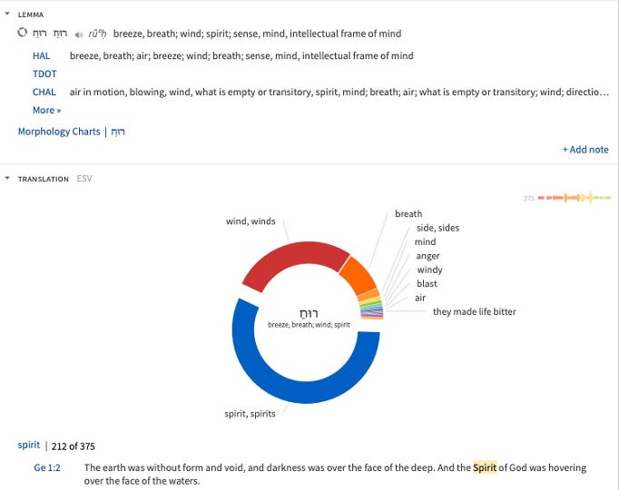First, the Hebrew word for Spirit is - rûaḥ occurs 378 times in Hebrew texts and 11 times in Aramaic passages. Its basic range of meaning is “wind, moving air, breath, or Spirit.”1